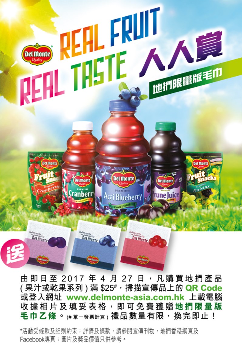 From now till 27 Apr 2017, upon any single purchase of Del Monte Products (Juice or Dried Fruit) amount $25 or above, scan the QR code or go to www.delmonte-asia.com.hk to upload the receipt photo and complete the form to have a chance and win Del Monte Limited Edition Towel 1pc.