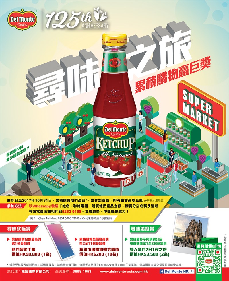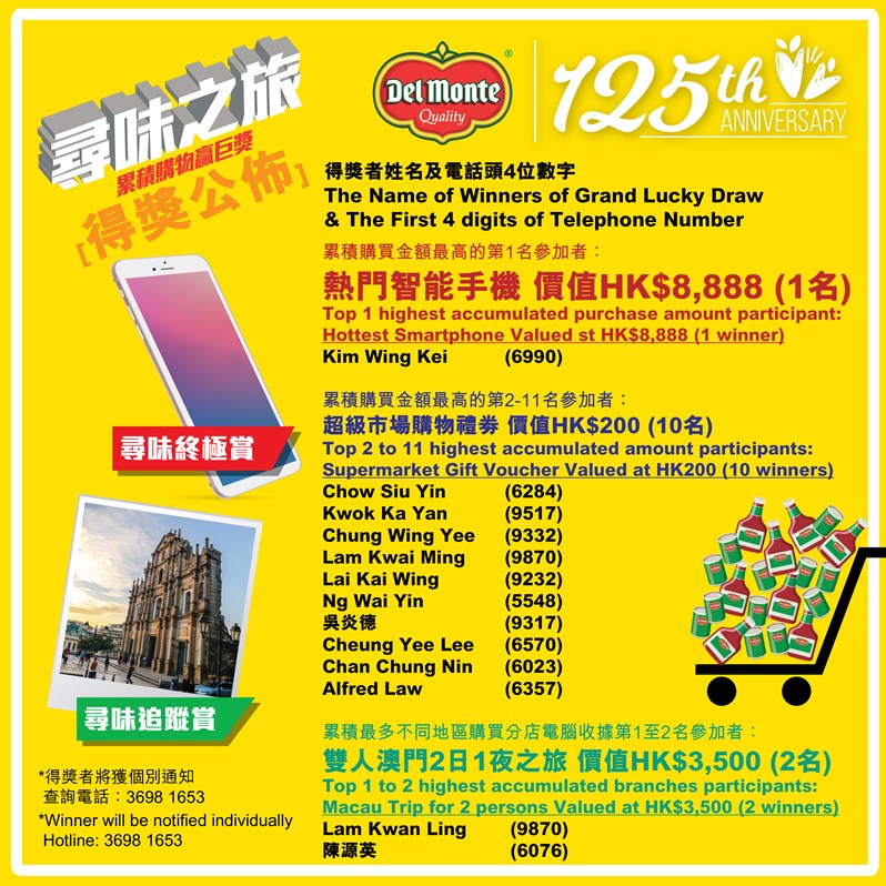 Winner list announcement will be published in Del Monte HK website and Del Monte HK facebook in November 8, 2017. Winners will be notified by letter for prize details.